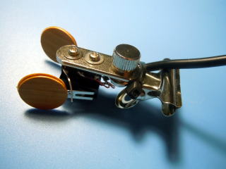 製作は、これまでのものと変わりません。2穴の金具を使用し、めがねクリップに3mmのローレットビスで固定しています。通常のビスでもよいのですが、少しデザインに凝ってみました。ケーブルの固定にはインシュロックを活用し、導線のハンダ付け部分にテンションが掛からないようにしています。