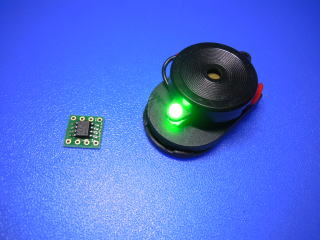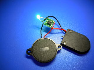 このバージョンではスイッチを入れると光と音の機能確認のため高速の点滅と断続音が出ますが、初期設定ではその後の音は出ないようにしています。押しボタンを押すことで音を出したり停止したりすることができます。