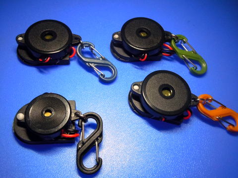 ピエゾ素子サウンダーとCR2032のボタン電池ケースの間に、マイコンをサンドイッチしています。電池ケースにはスイッチがついているので、パーツ相互を配線するだけで出来上がります。サウンダーの取り付け穴はLEDの固定と、ストラップの取り付け穴として使いました。
